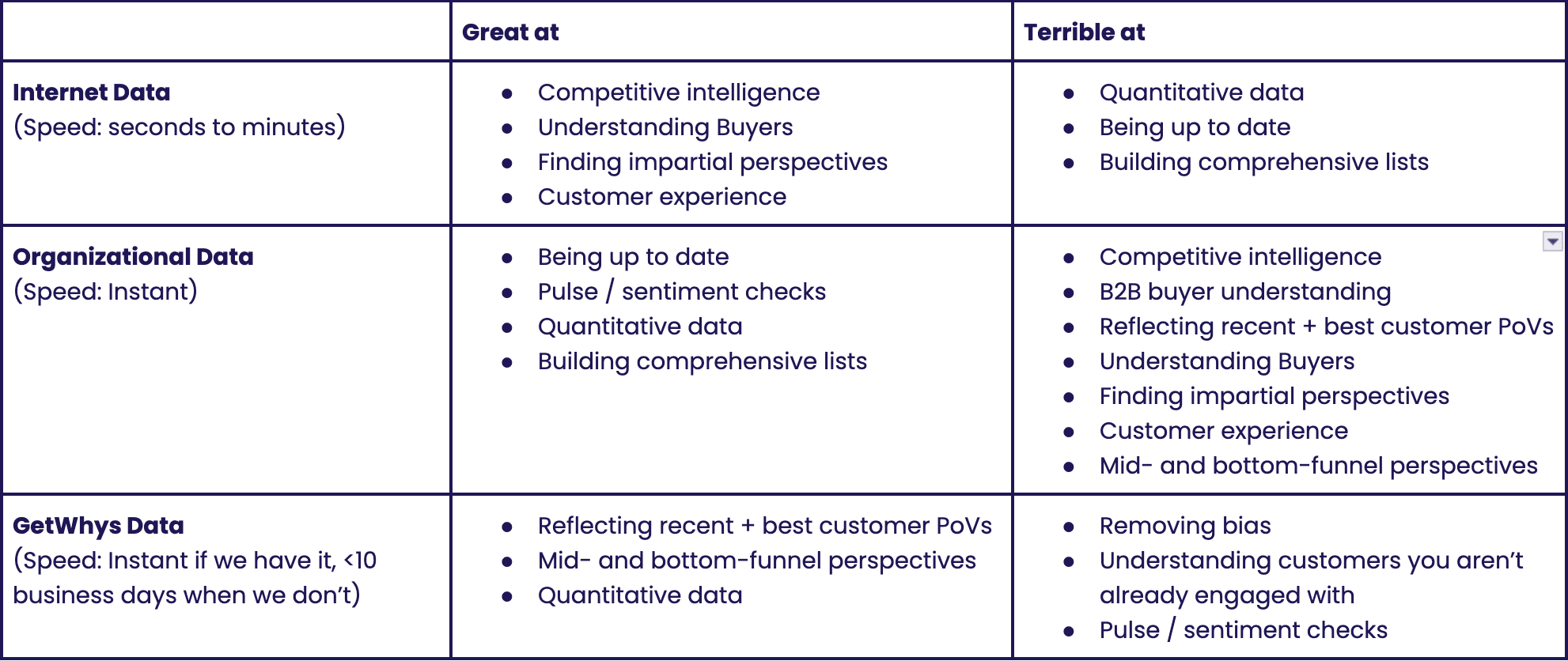 Our customers can now layer those datasets on top of GetWhys data. We’ve spent two years building a massive dataset of real in-depth interviews with b2b software users and buyers. Our dozens of interviewers grow it every single day. We’re never giving up the advantage of real, primary research.