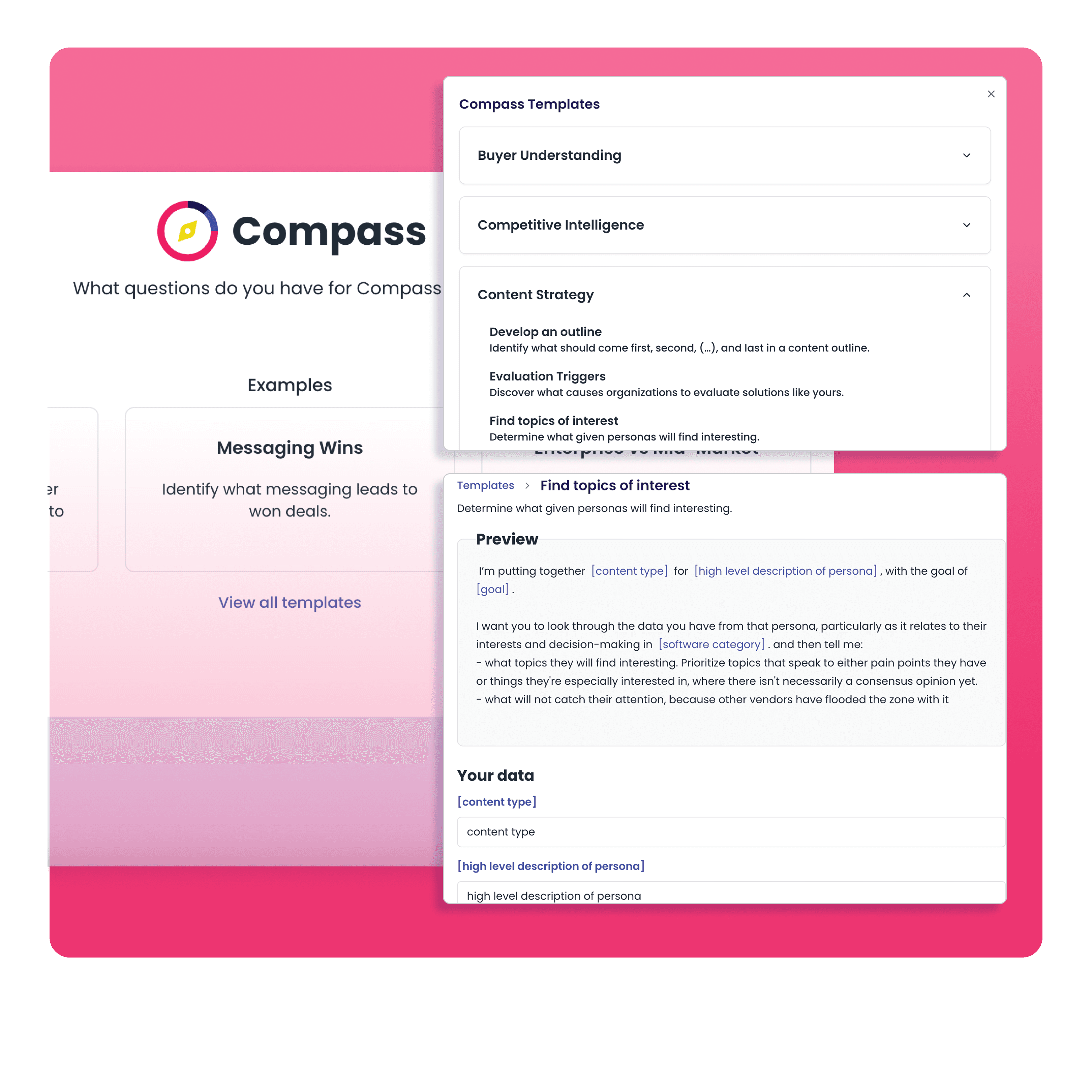 Our products pull from three different data sources: the Internet, your organization’s internal data, and our database of in-depth interviews.
